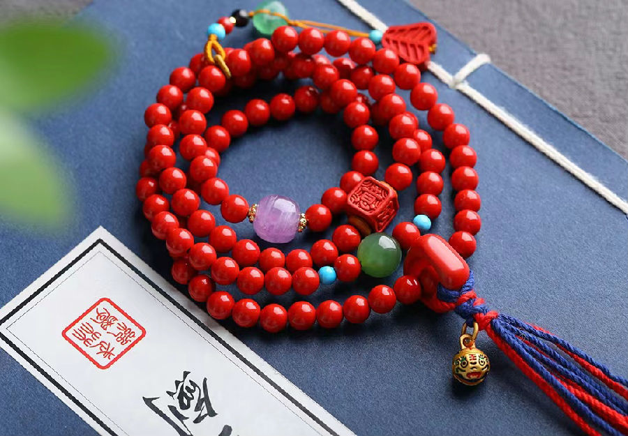 在F教的文化里,朱砂常被做成F珠、念珠,用以持佛念經時使用,其能使人沉心靜氣,心神安定,意念集中、智慧提升,是禮佛之人必備的吉祥物。