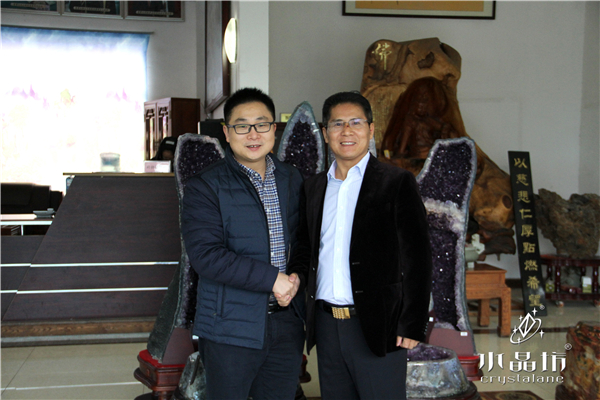 2016年2月16日至2月17日,水晶坊創(chuàng)業(yè)集團迎來了新年新氣象,來自廣西的客戶組團考察水晶坊,水晶坊創(chuàng)業(yè)集團董事長曾勇先生親自陪同接見。曾勇先生向玉董先生介紹感恩文化及愛心事業(yè)曾勇先生在辦公室向玉董先生介紹藏品 來自今智塔財神----廣西橫縣聚成生物科技有限公司董事長玉董先生。攜親友團一行17人參觀了中崛水晶坊展廳,了解水晶坊品牌發(fā)展歷程以及水晶坊連鎖加盟項目的相關情況,并在水晶坊會議室
