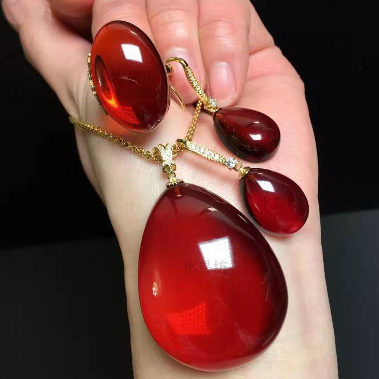 精品特惠,歐洲進口穿天然歐款血珀套裝,波羅的海料,油潤血紅,通透明亮,完美無暇,波蘭工藝,純銀鑲嵌,吊墜套重11.8g,尺寸33*25*11mm,戒指8.1g,尺寸22*16*11,保值