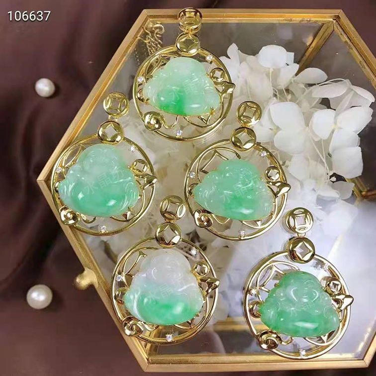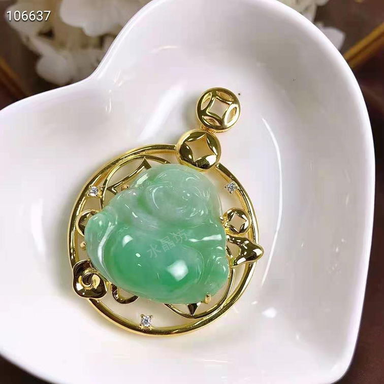 天然A貨翡翠精雕笑佛,面容慈祥,大肚能容,有種有色果綠飄花水頭好,925純銀厚鍍24K真金精工鑲嵌如意云紋鏤空圓牌吊墜。