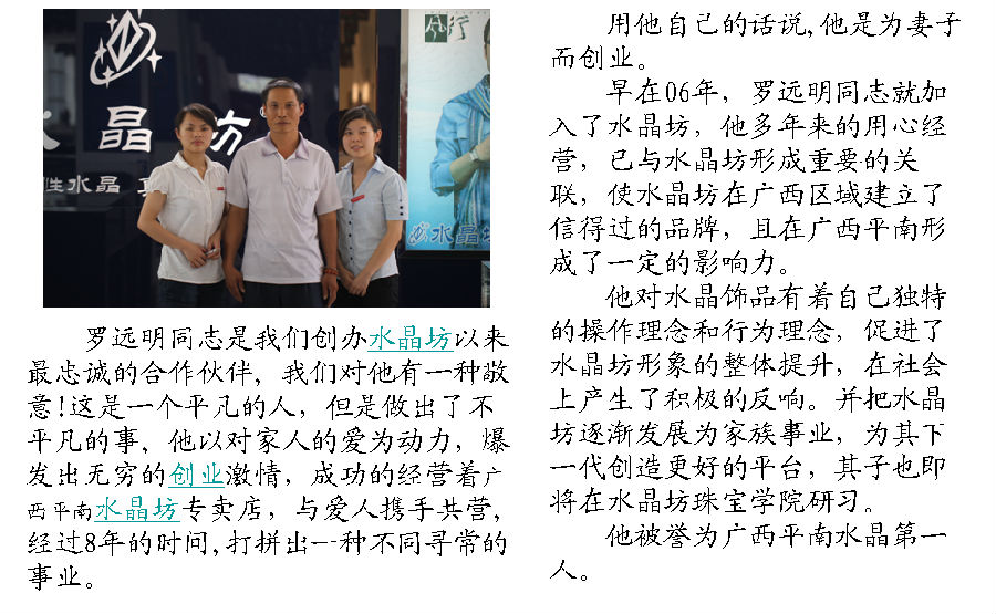 導(dǎo)讀:我叫羅遠(yuǎn)明,我是水晶坊廣西平南縣專賣店的老板,我是2005年與公司合伙的,當(dāng)時(shí)公司還在長(zhǎng)沙楊家山,那時(shí)候我和我愛(ài)人每隔一段時(shí)間就要來(lái)長(zhǎng)沙選貨,交通也不是很方便,可以說(shuō)這幾年我們兩口子真的付出了不少的汗水,今天我第一次來(lái)湖南金玉堂珠寶公司總部寧鄉(xiāng),我最有感觸的就是,湖南金玉堂珠寶公司現(xiàn)在的規(guī)模在國(guó)內(nèi)算得上水晶飾品行業(yè)的老大哥了,我覺(jué)得我當(dāng)初沒(méi)有選錯(cuò)行業(yè),這次我親自來(lái)總部選擇公司最新款、最時(shí)尚、最精湛、最流行的產(chǎn)品,到總部來(lái)學(xué)習(xí)一下店面的布局和擺放等知識(shí),我要讓我的水晶坊專賣店做得更大,產(chǎn)品更